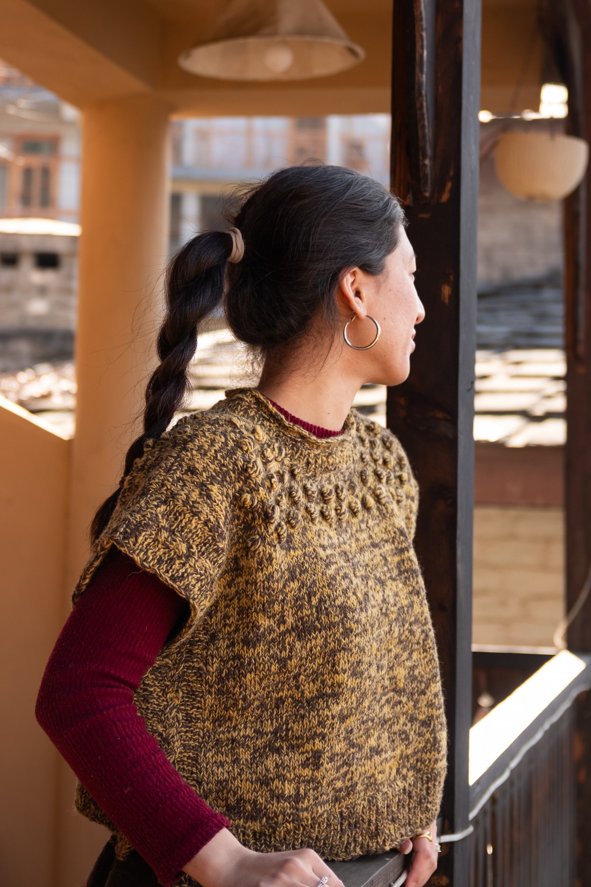 Handcrafted in the scenic hills of Naggar, India, this bubble vest showcases the exceptional artistry of Kullvi Whims' skilled artisans. Constructed from 100% pure wool, each piece is made by hand, ensuring quality craftsmanship and supporting the talented women behind every creation. A versatile layering essential that combines traditional techniques with contemporary style.