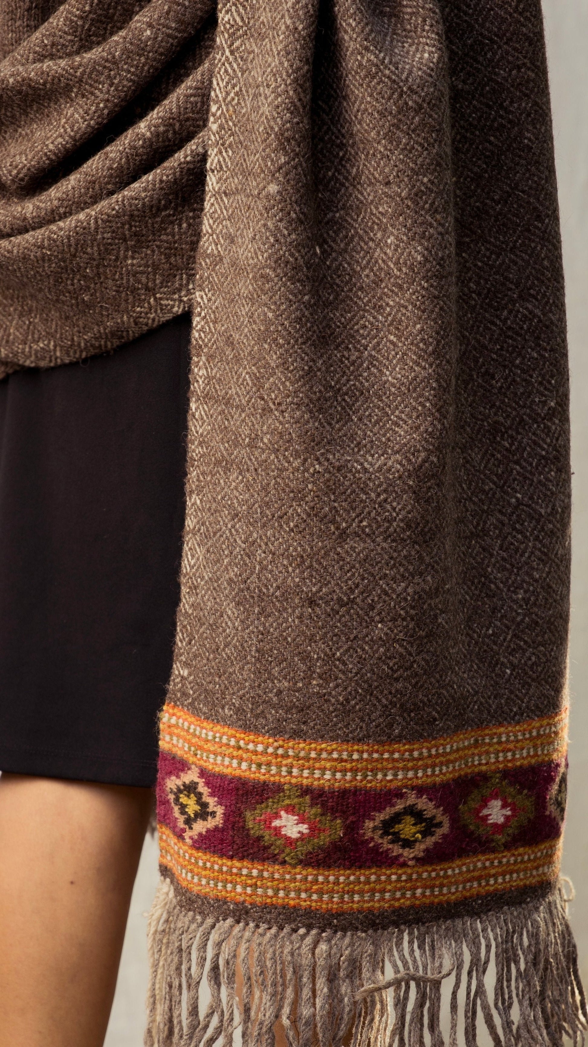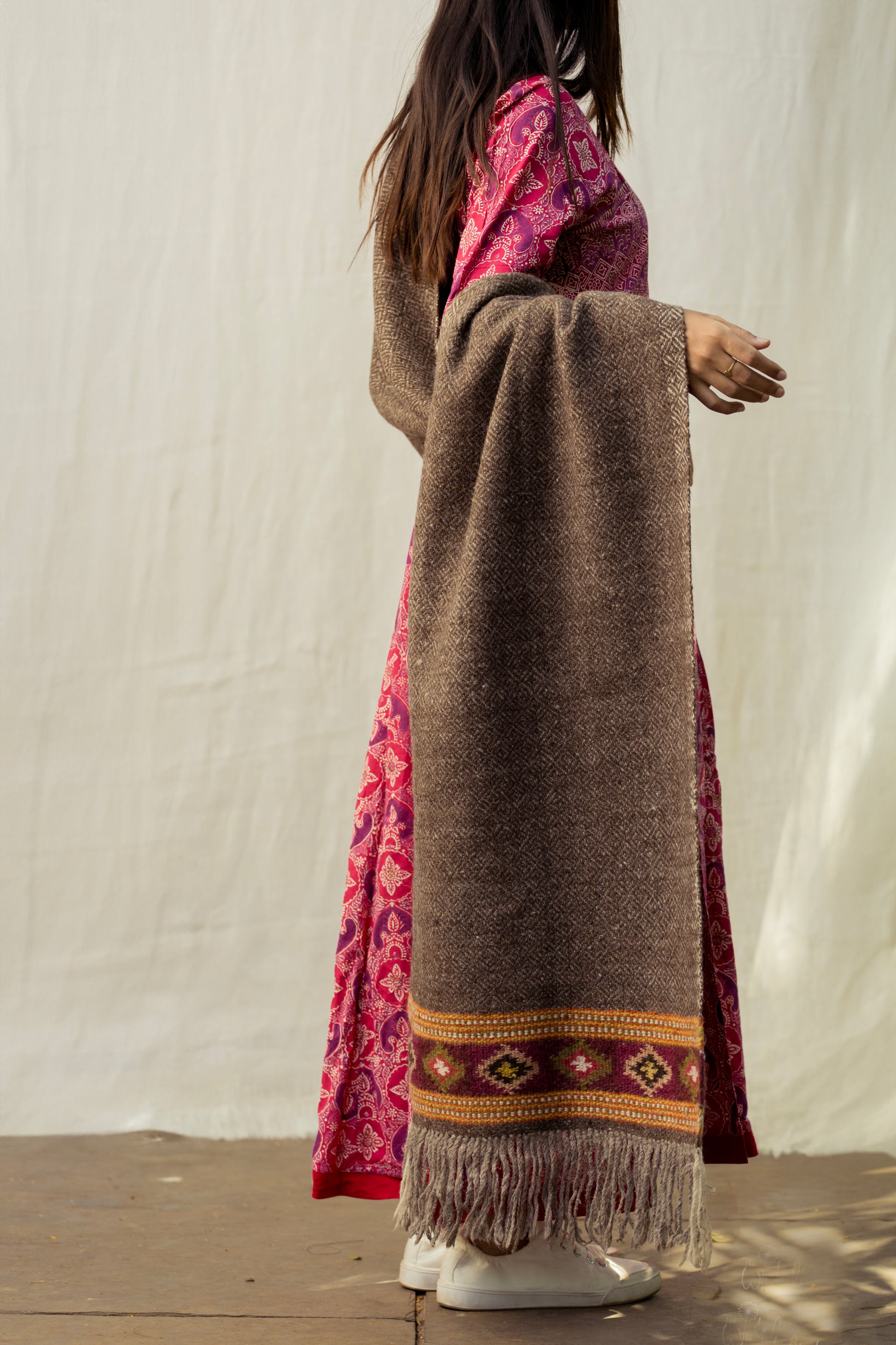 Our heritage shawls take inspiration from traditional Kullvi motifs which have symbolic significance, such as a water source surrounded by land or a chain of mountains, and a coin representing fulfilment of a wish.