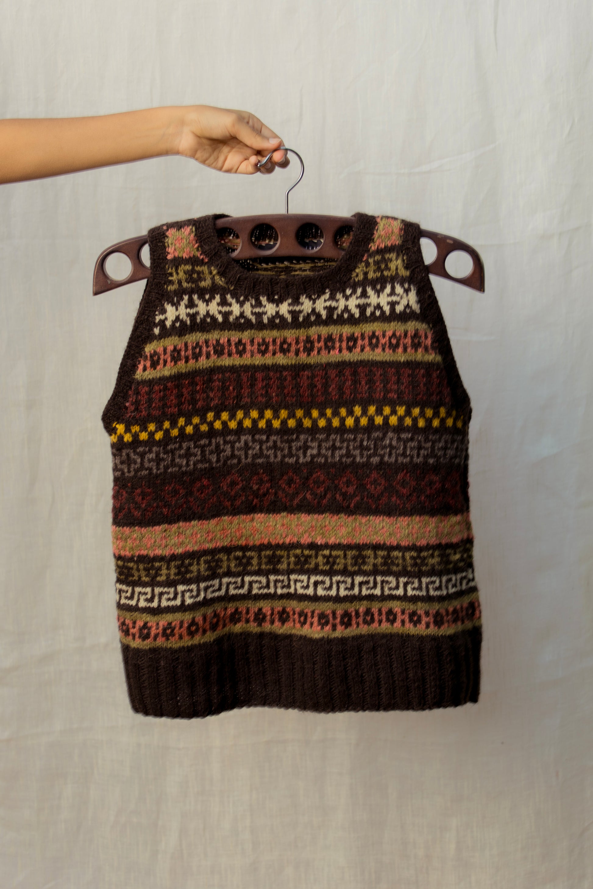 Inspired by the motifs of Lahaul, these handknitted vests have been crafted from handspun, naturally-dyed indigenous Himalayan wool.