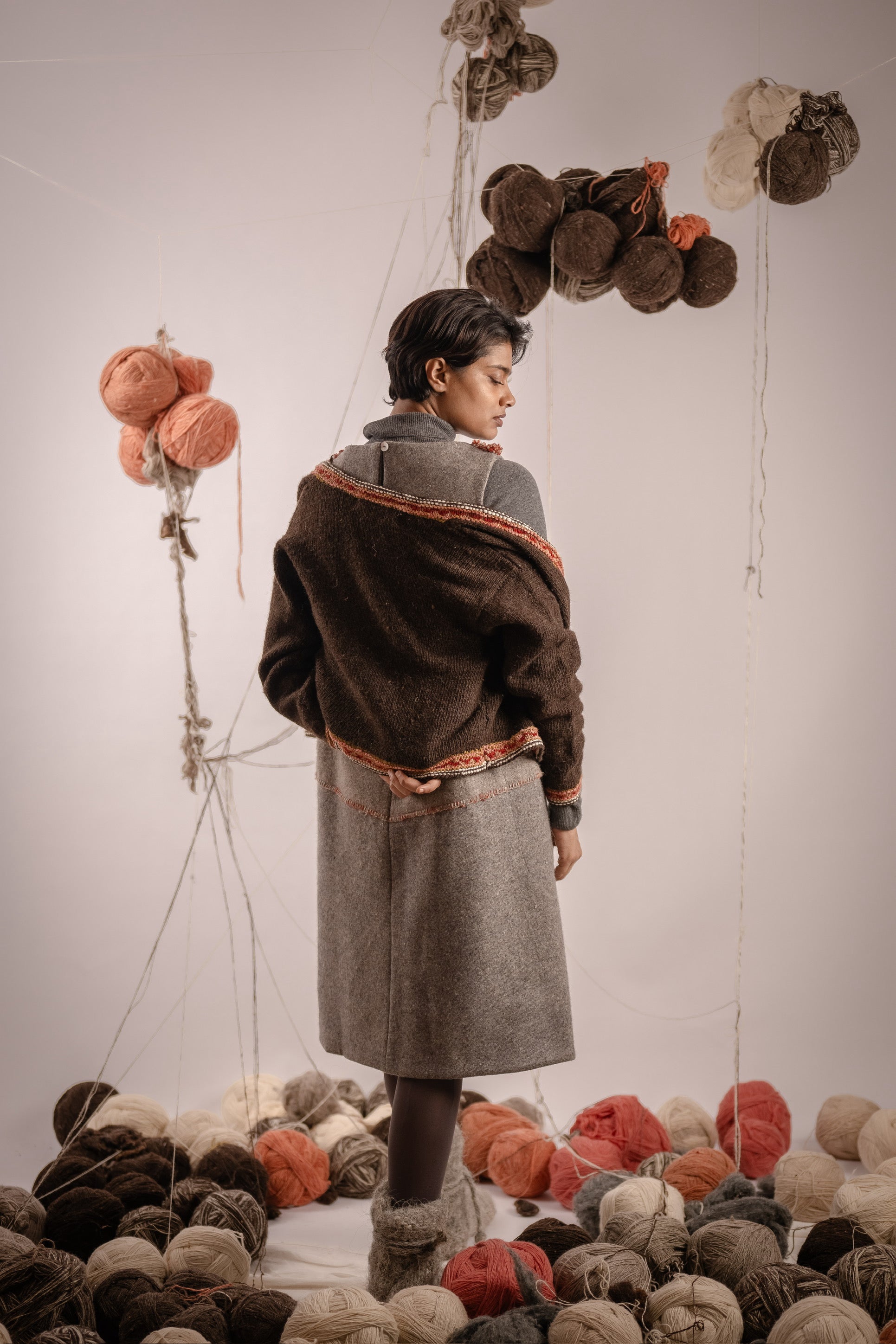 This timeless cardigan is a versatile essential, crafted from soft, hand-spun wool and accented with a richly patterned border. Perfect for layering, its minimalist silhouette highlights the vibrant detailing.