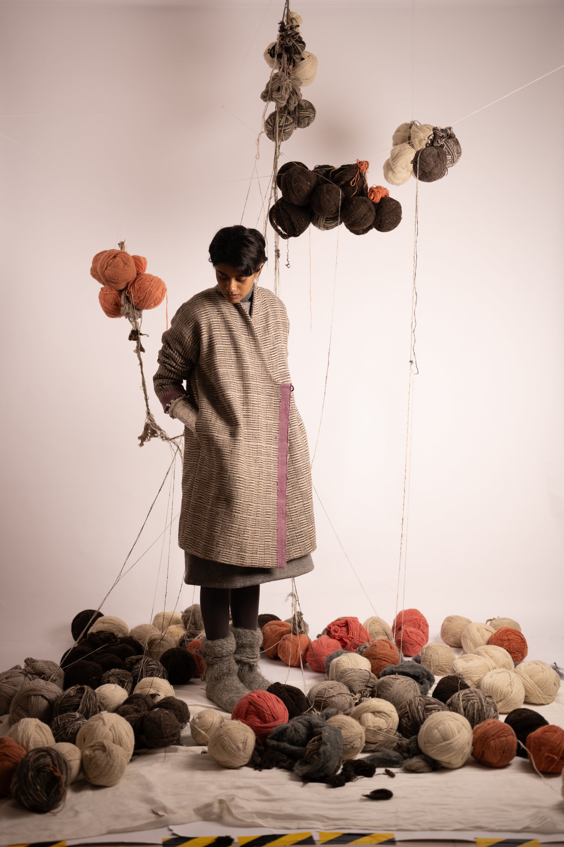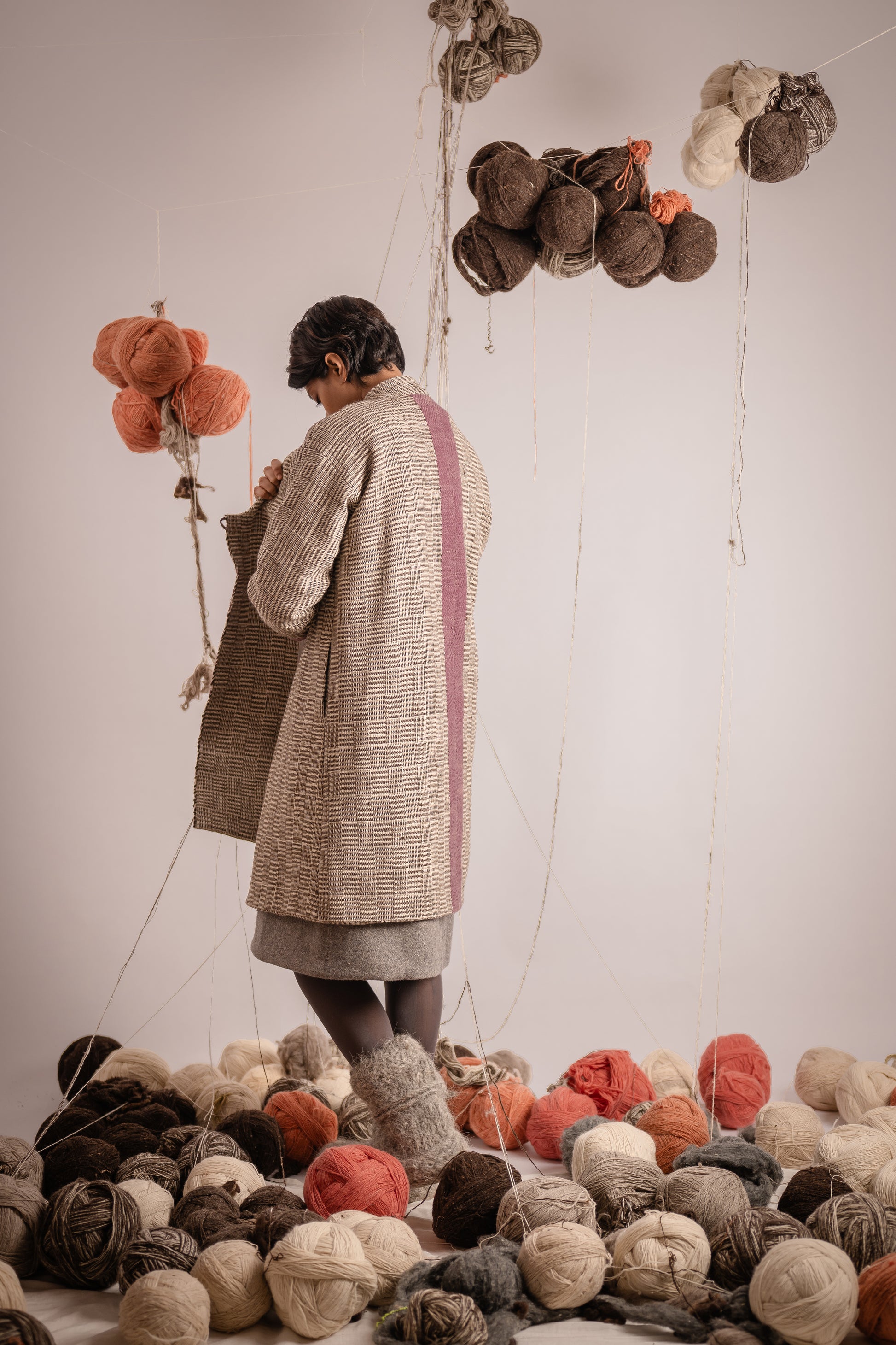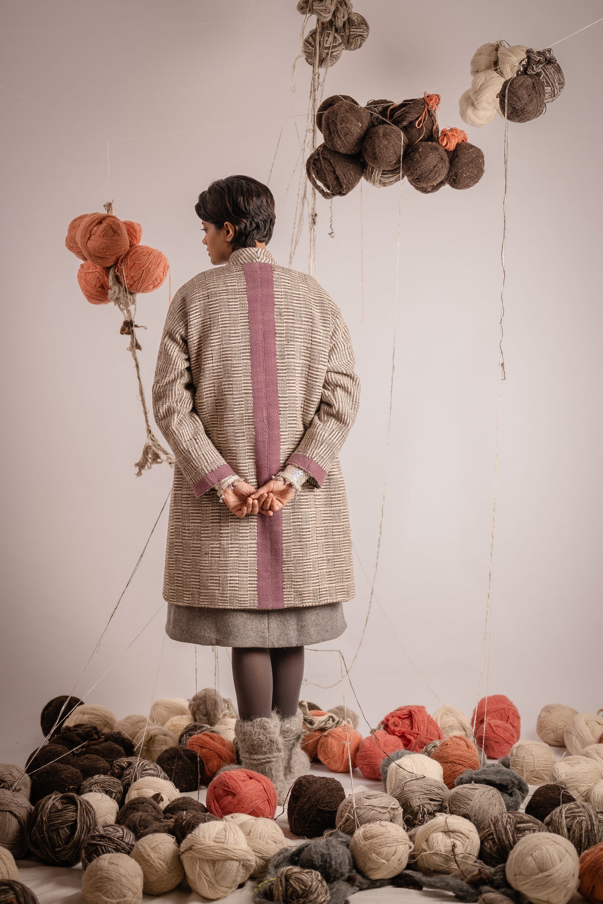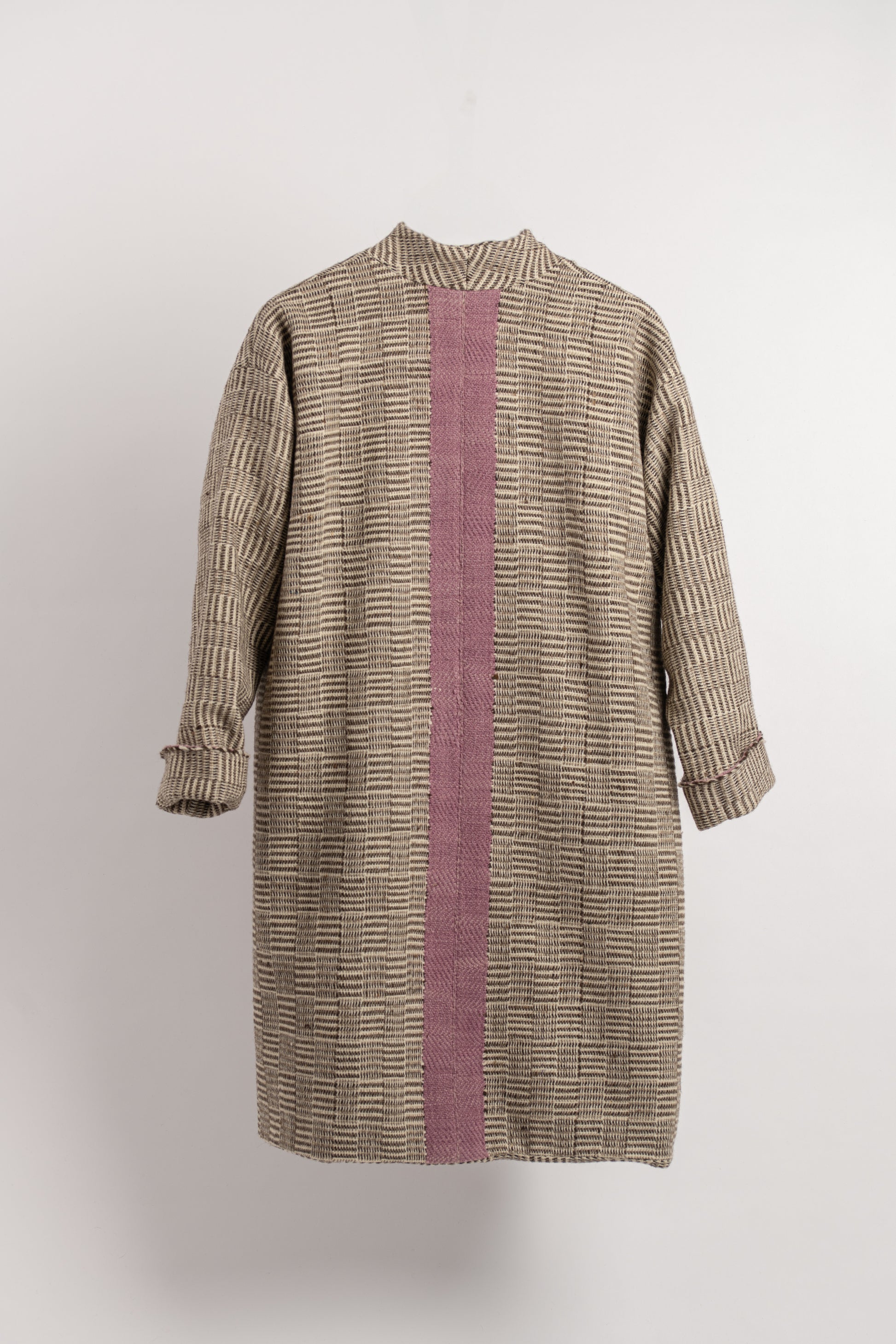 This crossover-style coat showcases the traditional Daabchitra weave, a variation of houndstooth. Featuring a naturally dyed lilac stripe running elegantly down the back, it embodies a seamless blend of traditional weave with modern design.
