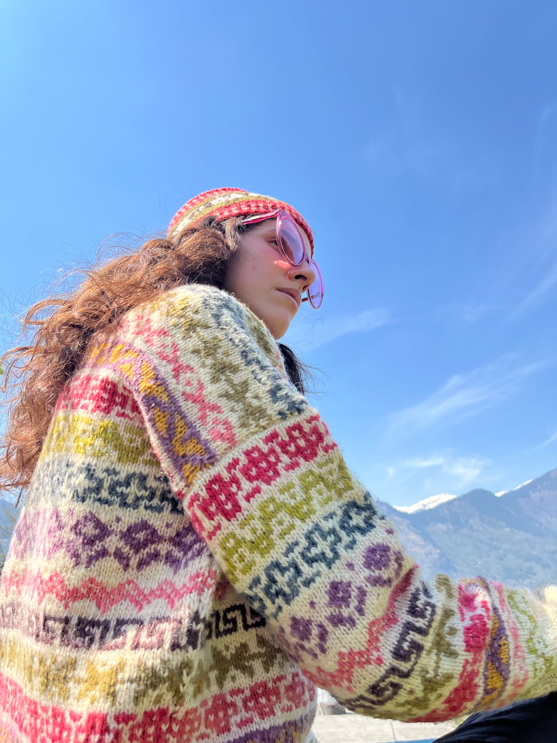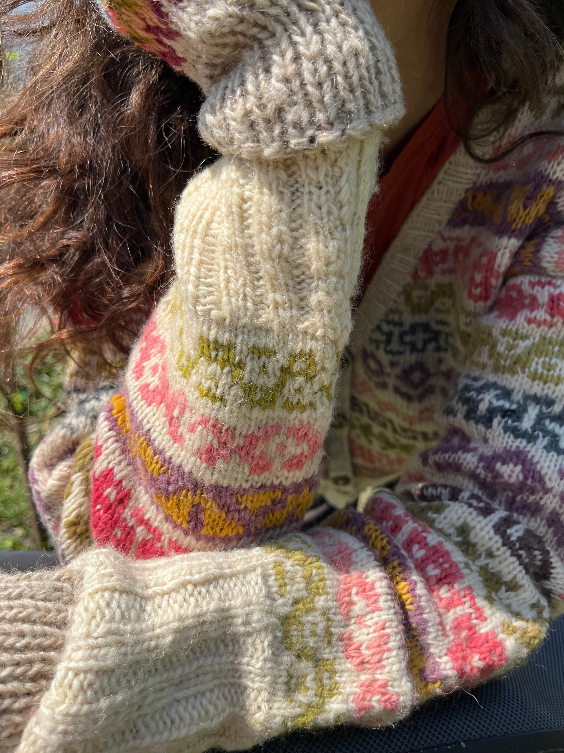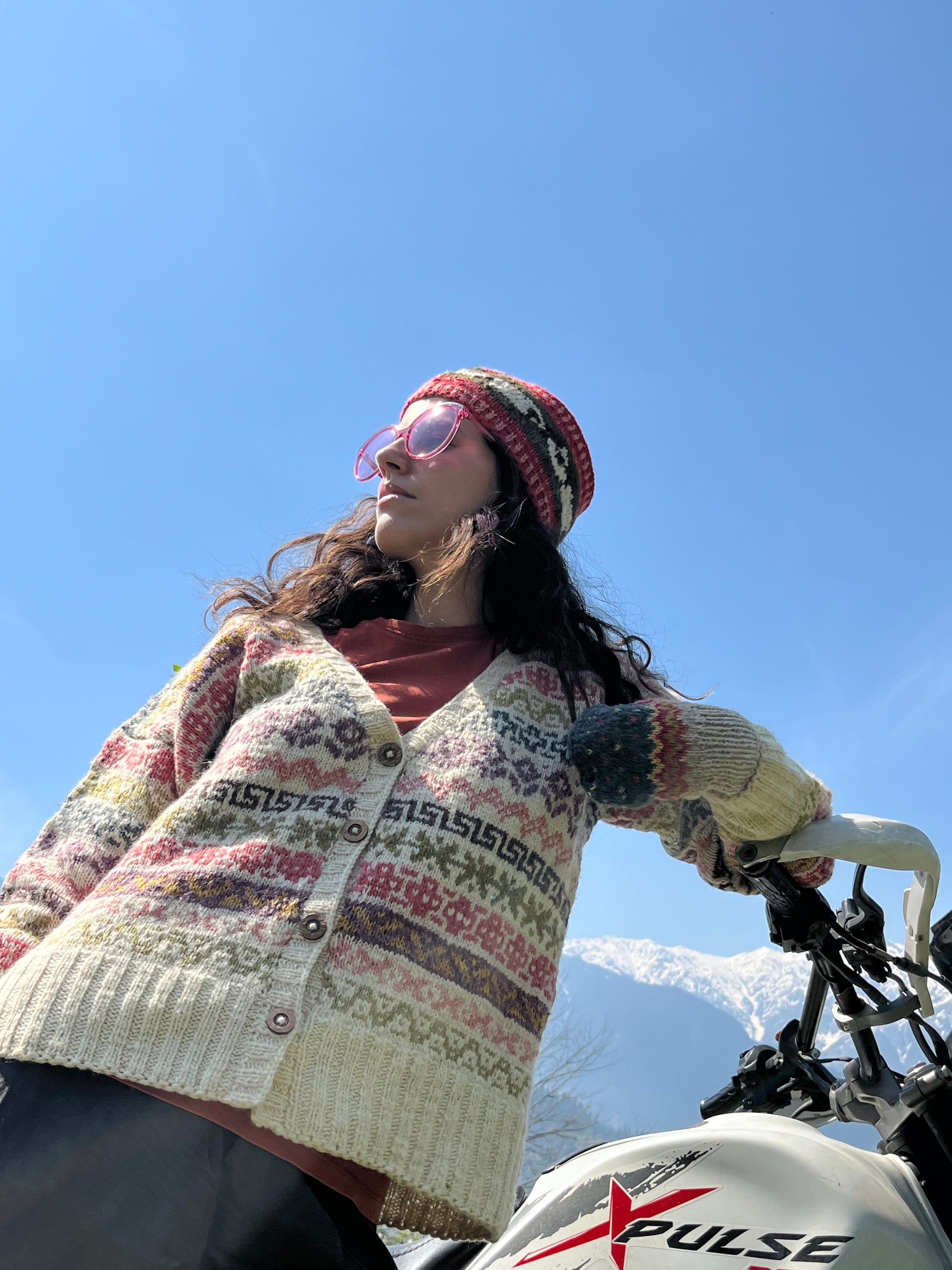 Wrap yourself in warmth and heritage with this hand-knit wool cardigan, inspired by the soft hues and geometric patterns of Himalayan craft traditions. Featuring a classic Fair Isle design in muted pinks, olives, mustard, and rust on a natural cream base, this cozy button-down is perfect for layering through changing seasons.
