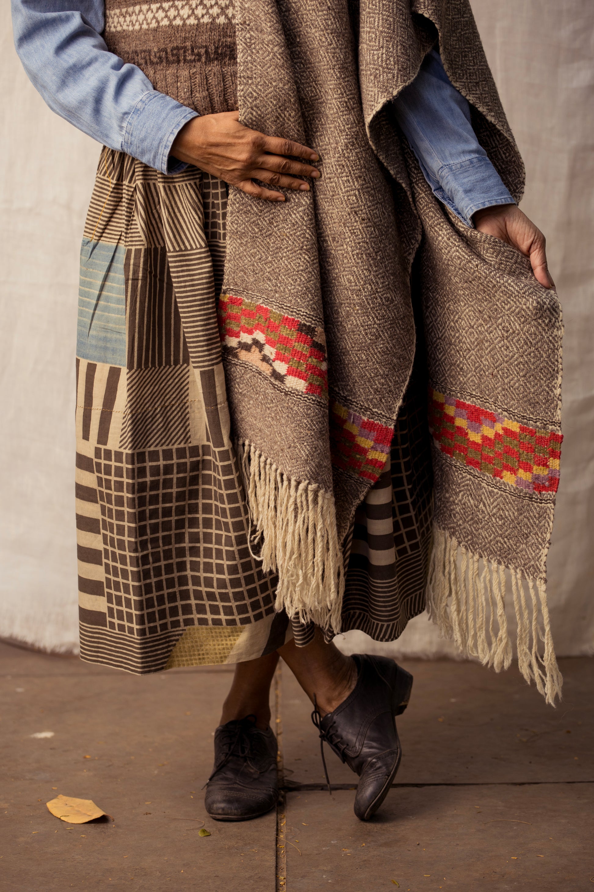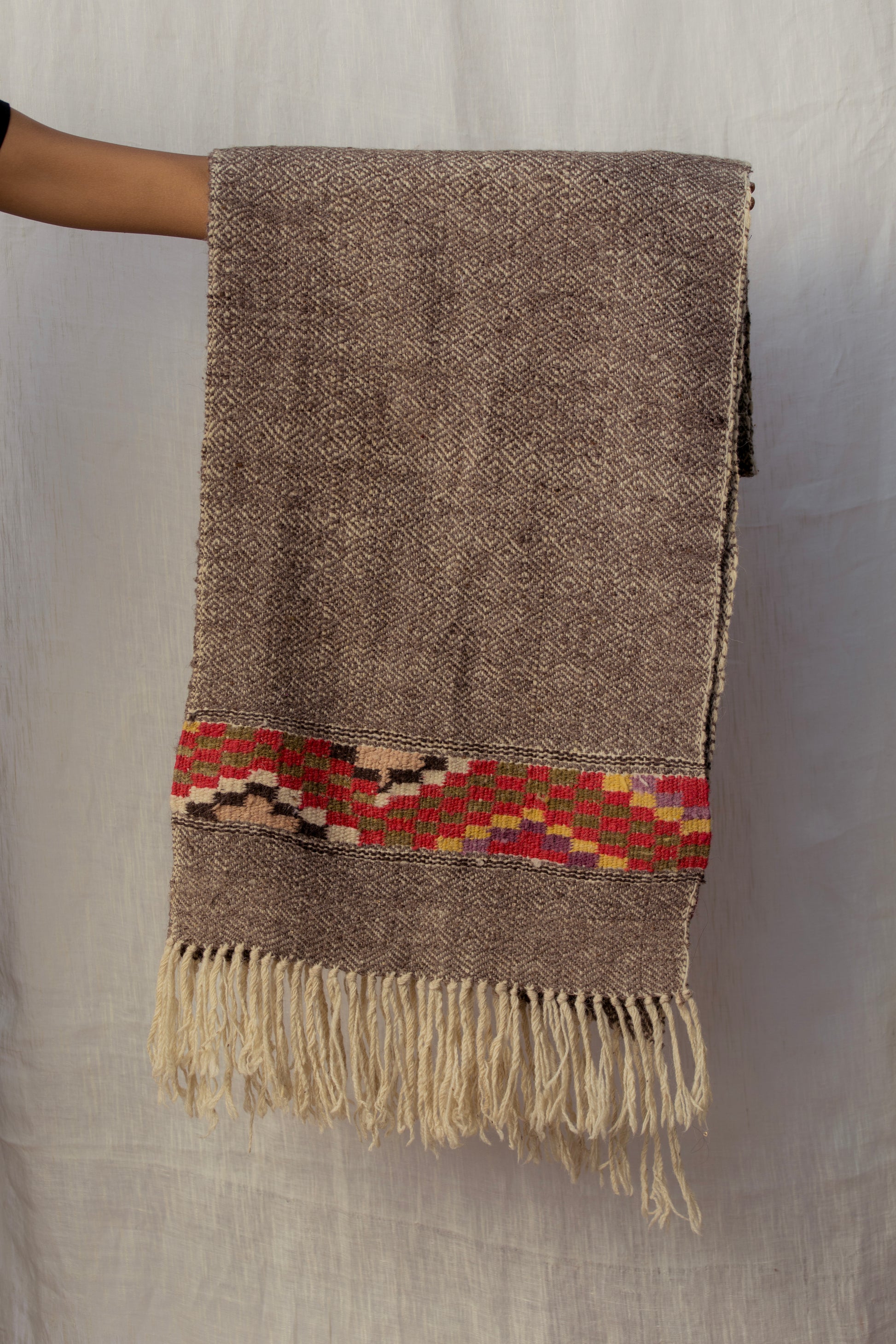 Our heritage shawls take inspiration from traditional Kullvi motifs which have symbolic and religious significance, such as a water source surrounded by land or a chain of mountains, and a coin representing fulfilment of a wish.