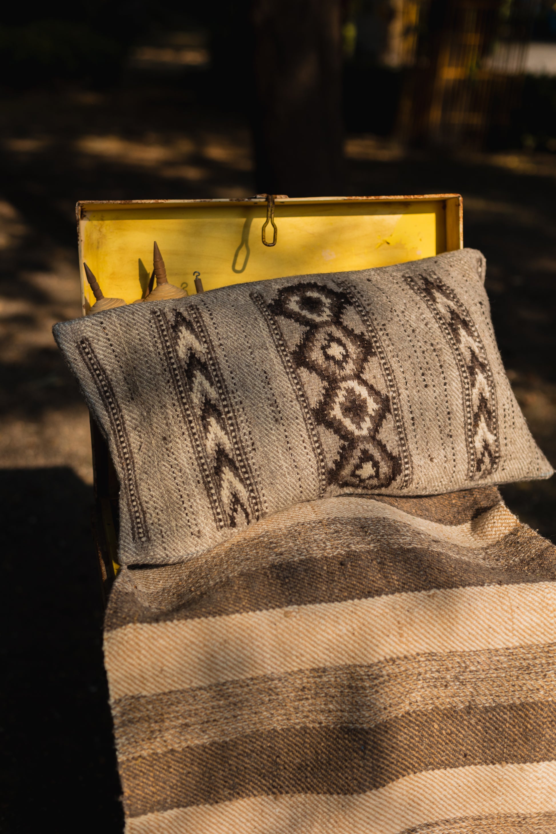 Our home collection is beautifully crafted with upcycled naturally-dyed woollen yarn from our production. We worked with our weavers to reinterpret traditional Kullvi motifs for a more contemporary context. The cushion covers are handmade from start to finish, therefore there may be minor variations from piece to piece.
