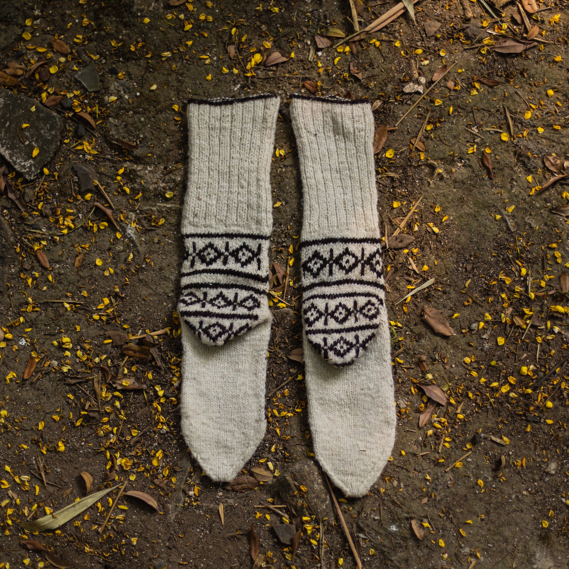 Extra thick, warm woollen socks with beautiful, unique motifs. These two-ply rugged socks are knit by the shepherding community of Lahaul with their own wool which they handspin on the wooden takhli.