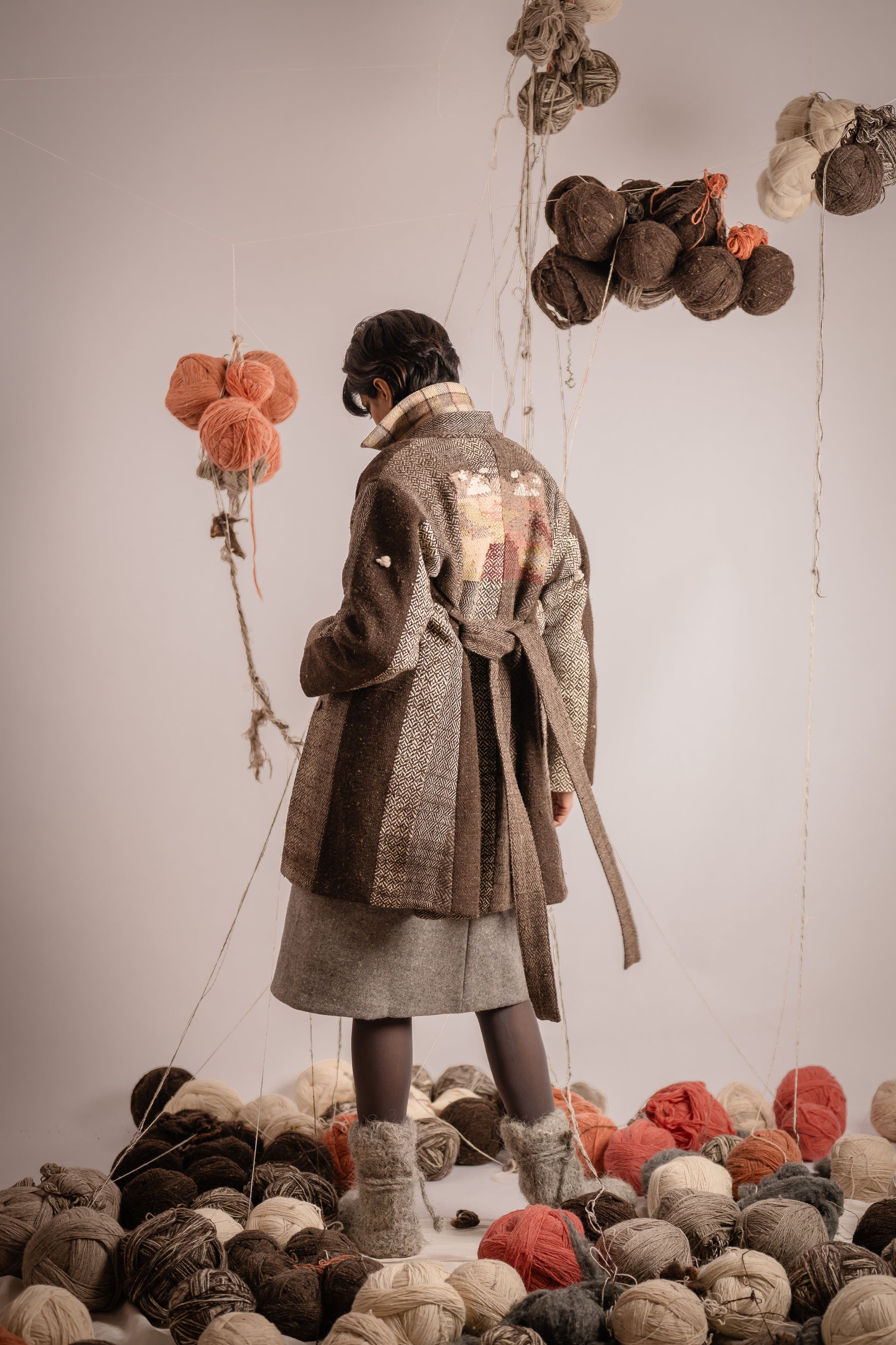 This mid-length coat features an upright collar and sash. The back showcases an artistic depiction of mountains and colourful skies through extra-weft weaving technique. Crafted from indigenous wool, it showcases a variety of traditional weaves in the rich natural wool tones of the gaddi sheep.