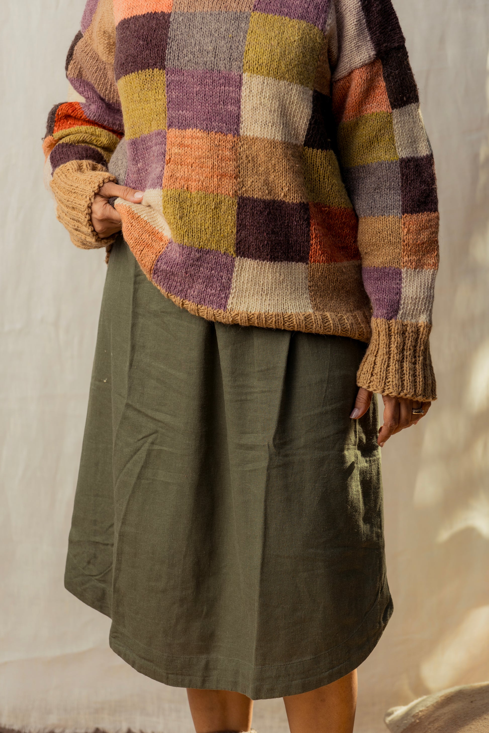 Our mosaic patchwork pullover beautifully crafted with upcycled naturally-dyed woollen yarn from our production. Each piece is unique and reminiscent of mountain landscapes - terraced fields, apple blossoms and snow capped peaks.