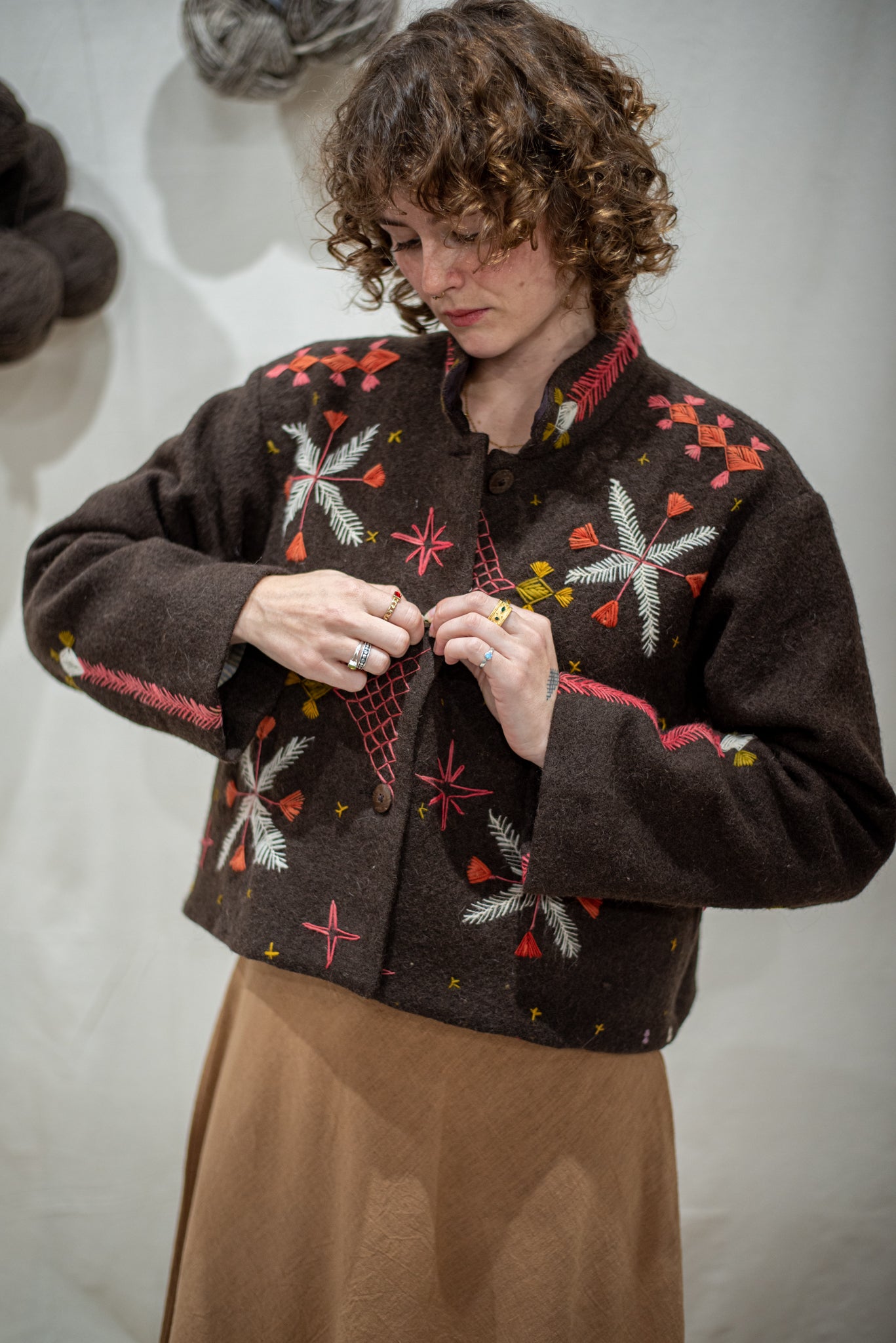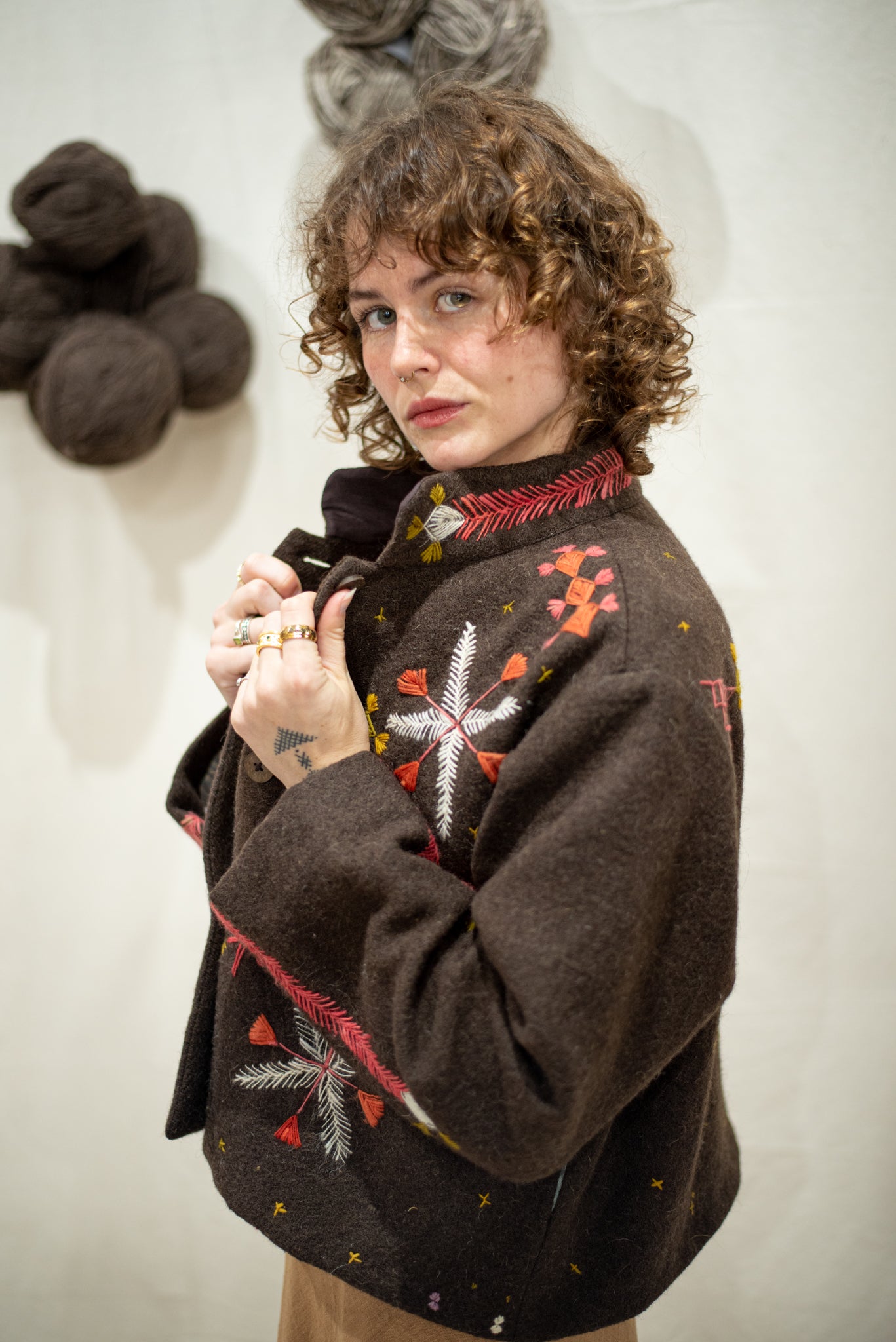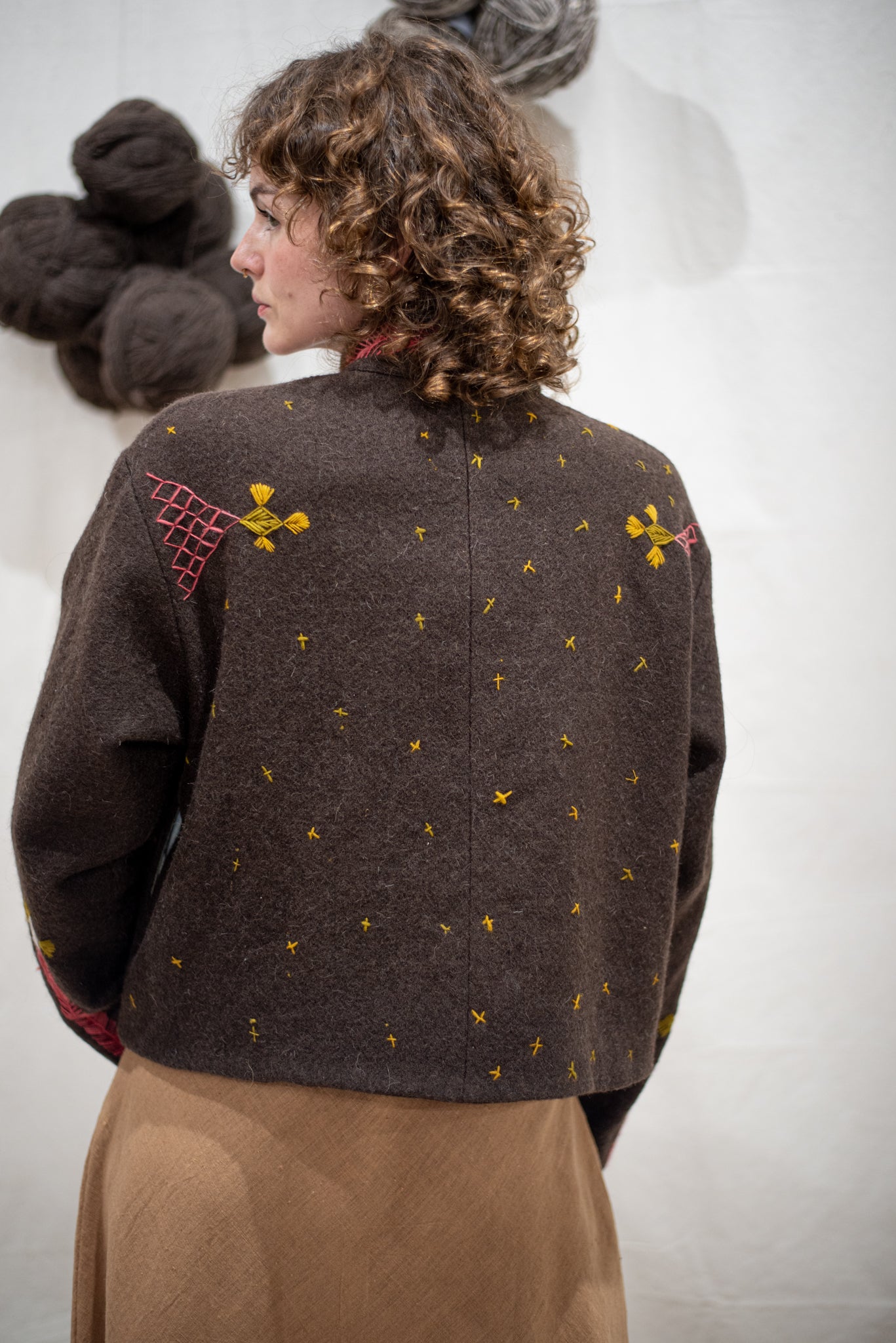 Featuring the versatile Tara jacket silhouette in fulled wool. We have collaborated with the Bakrewal community of herders from Kashmir for their vibrant and joyful traditional embroidery in our naturally dyed woollen yarn on this jacket.