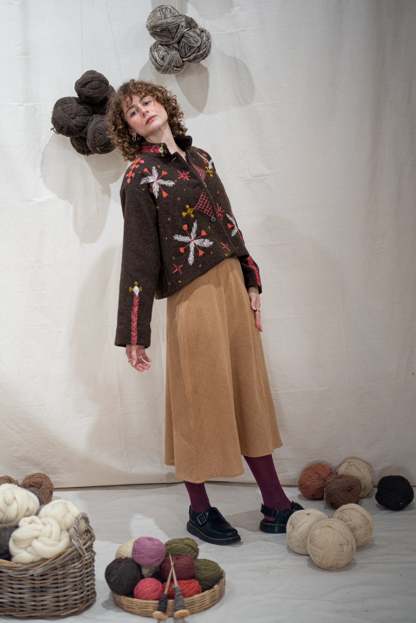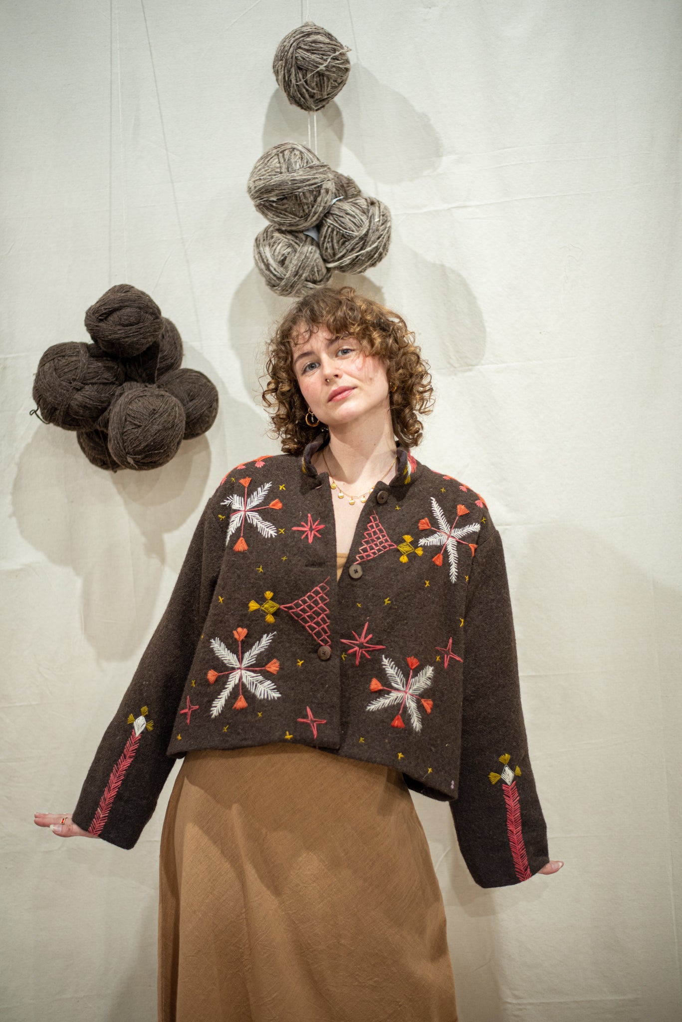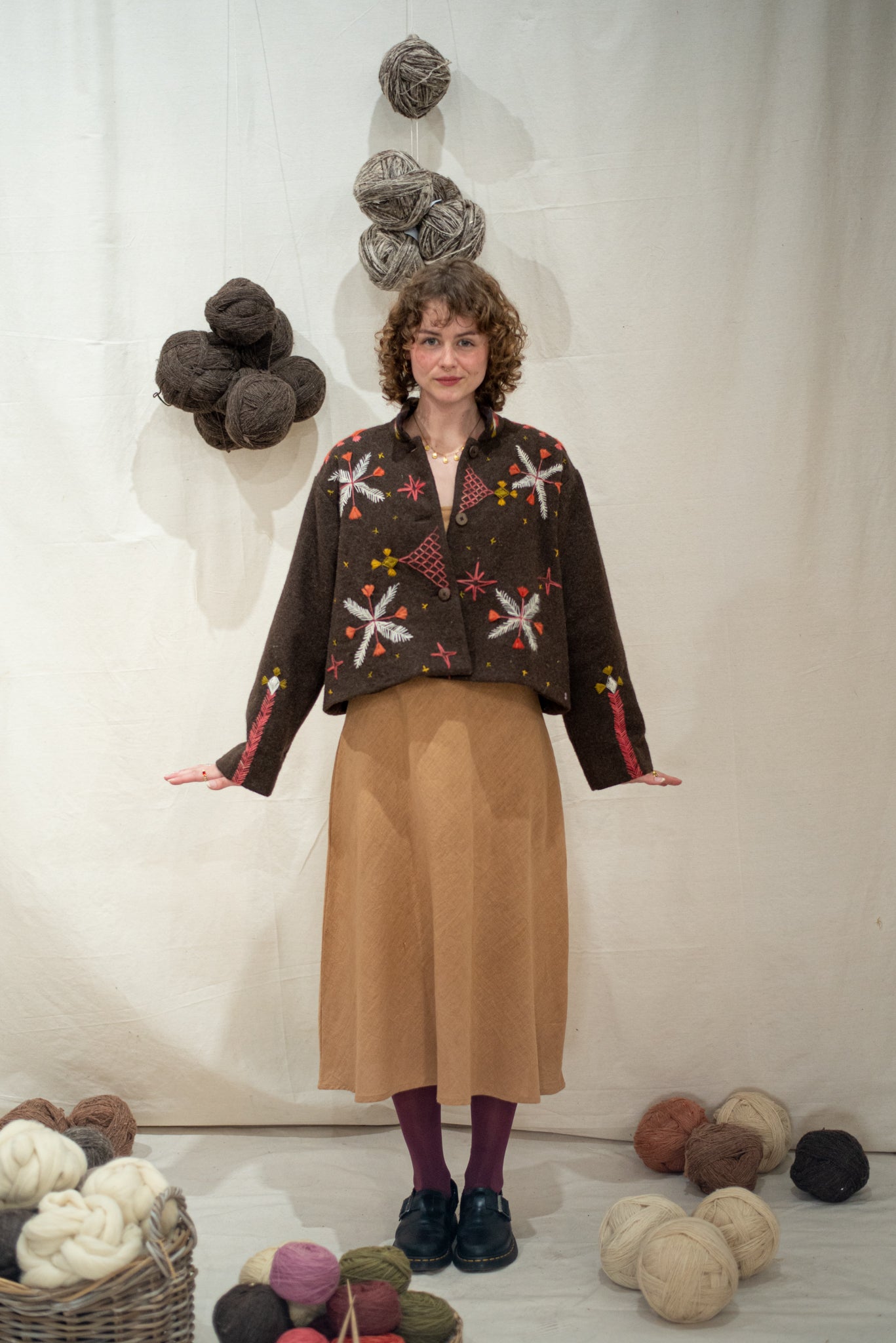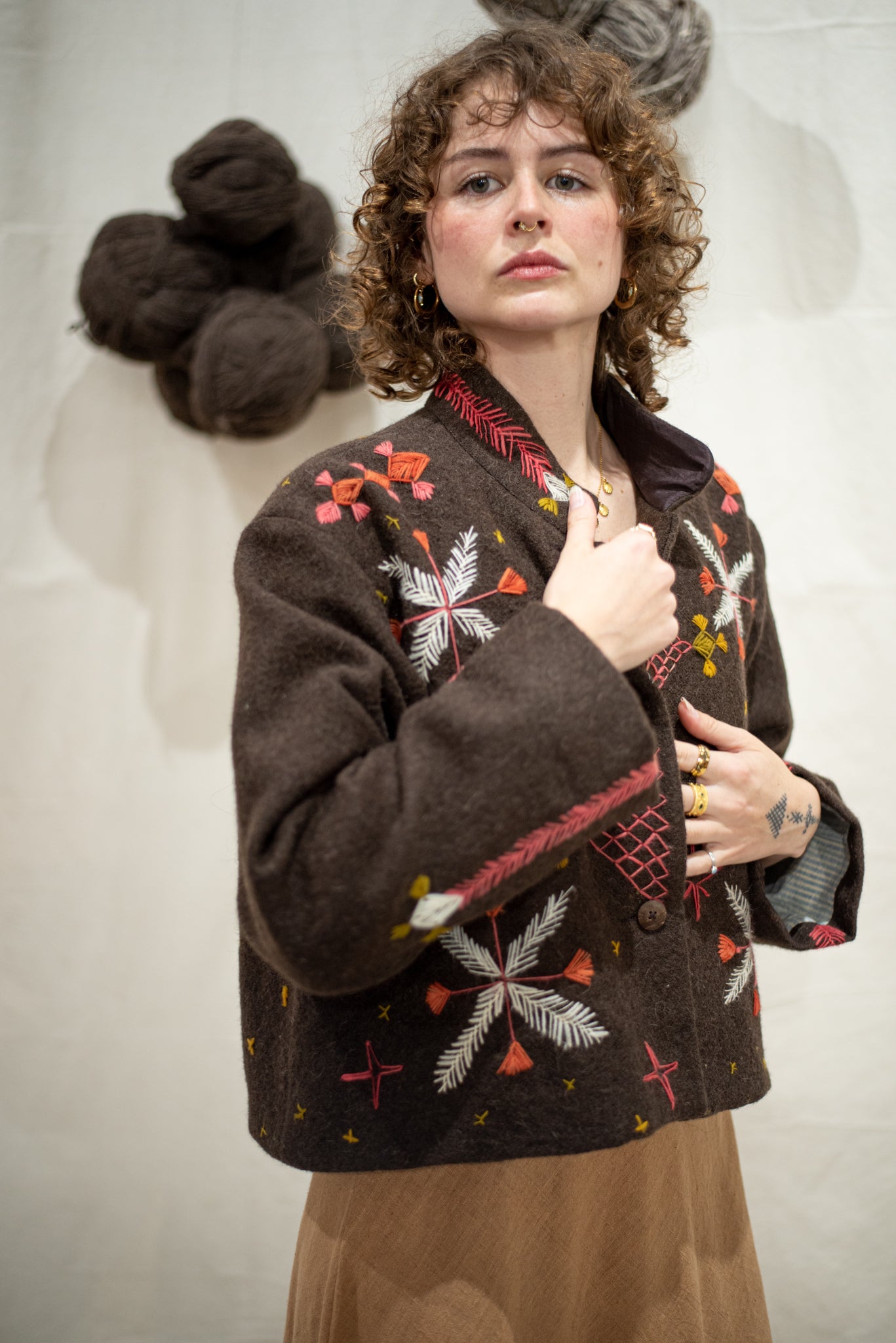 Featuring the versatile Tara jacket silhouette in fulled wool. We have collaborated with the Bakrewal community of herders from Kashmir for their vibrant and joyful traditional embroidery in our naturally dyed woollen yarn on this jacket.